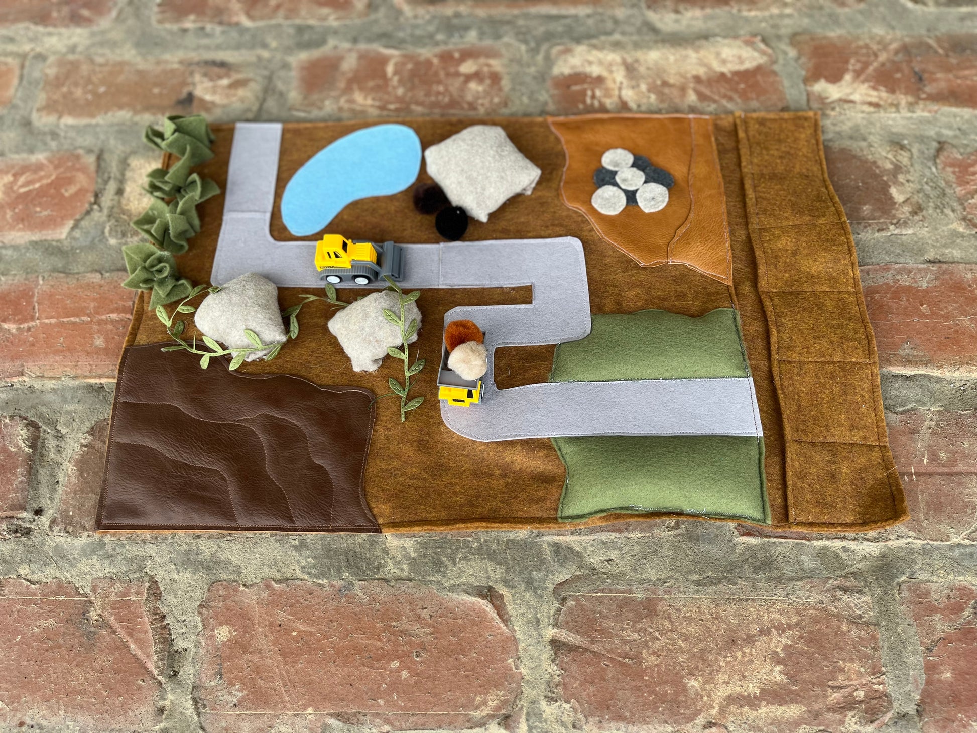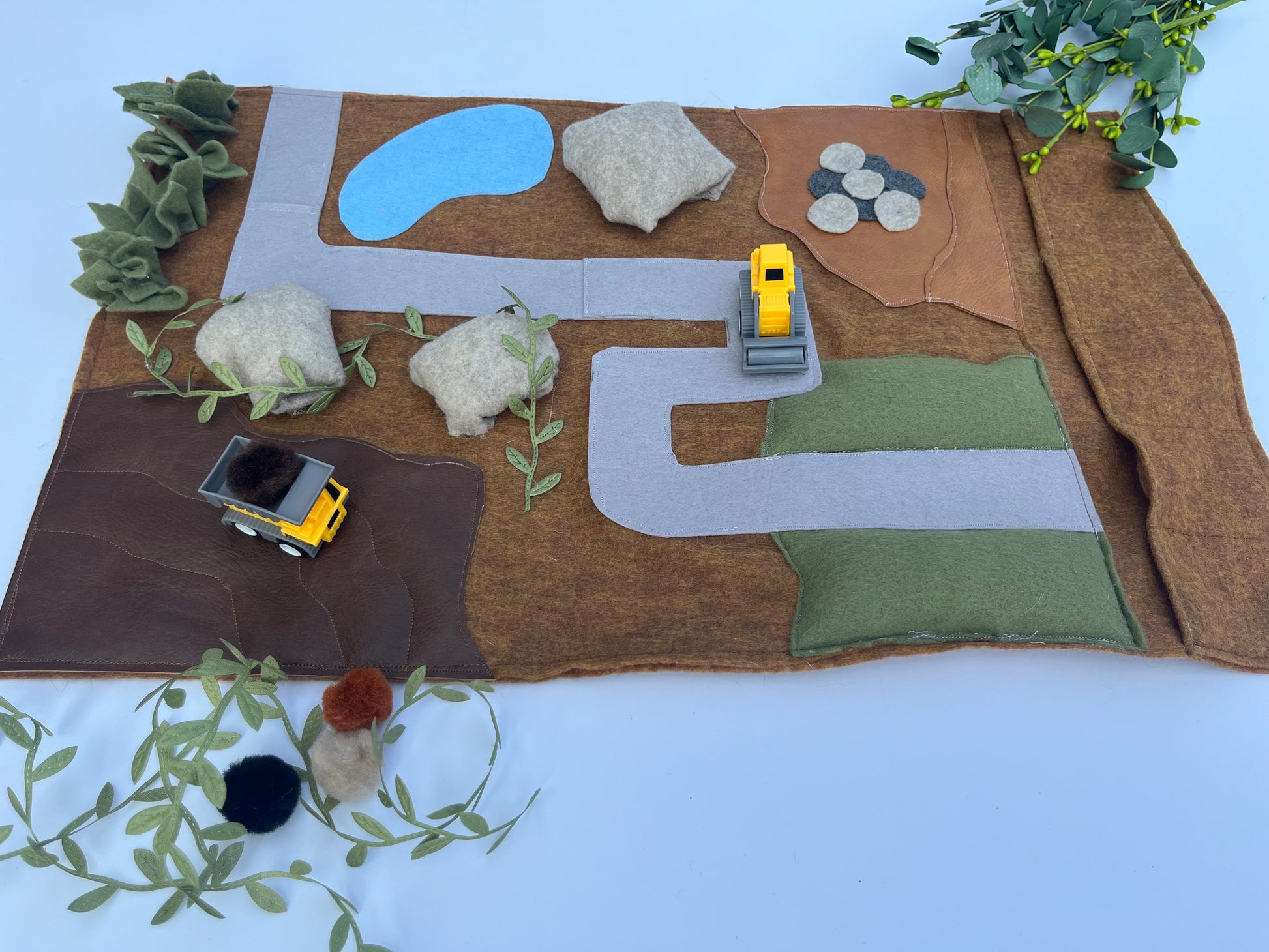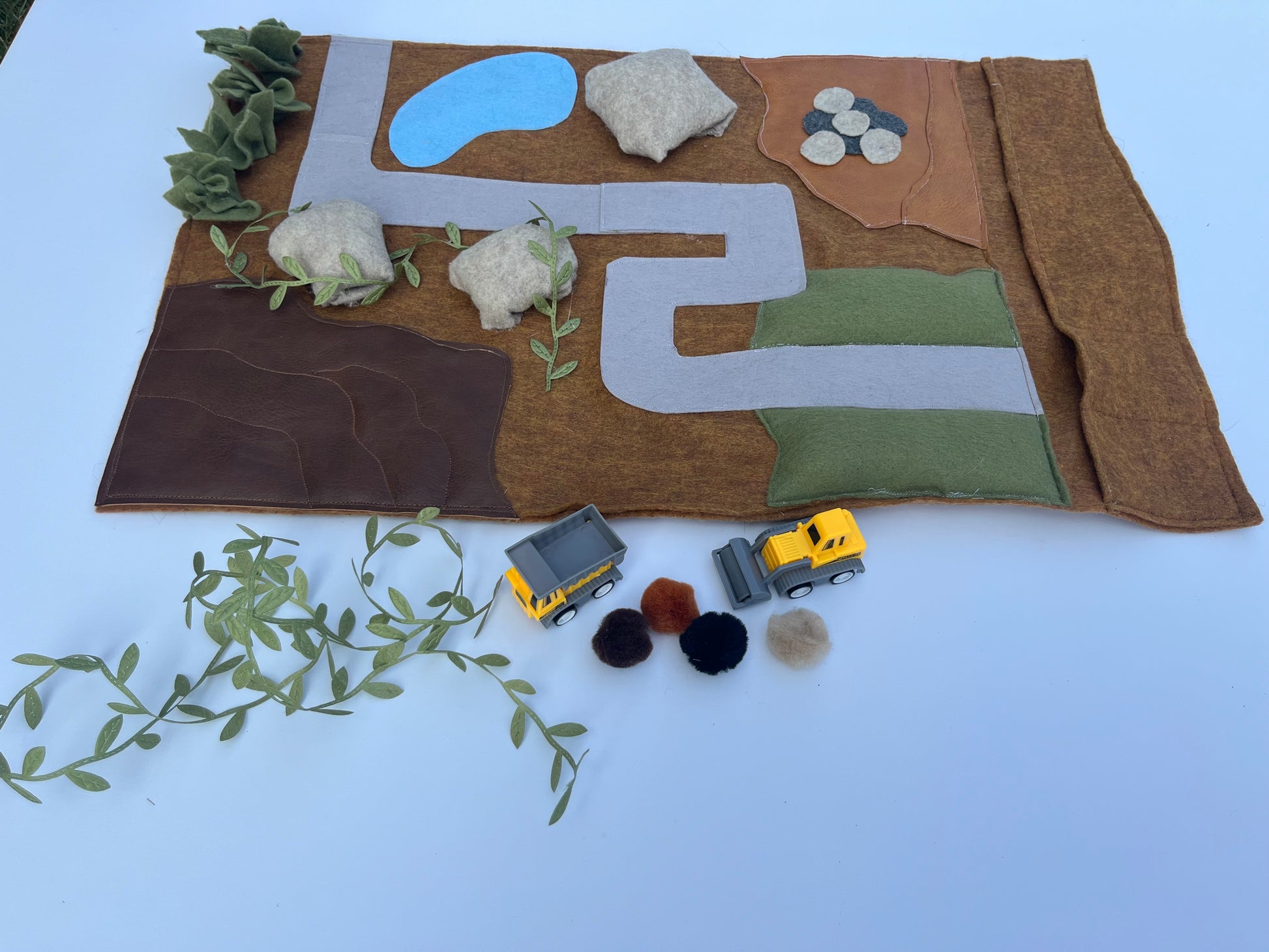 Play mat includes two construction vehicles and Pom poms (use as “rocks”)