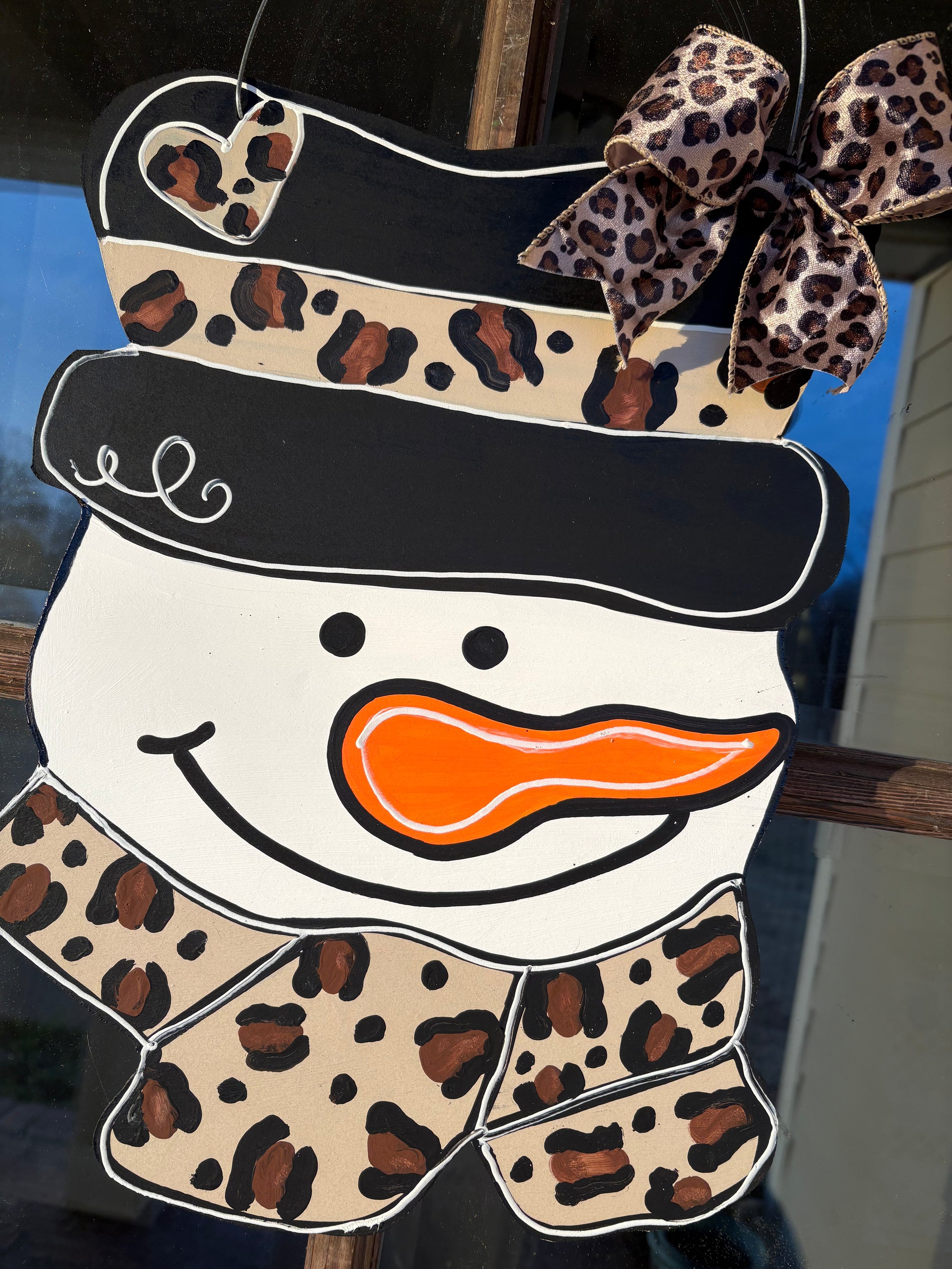 18.5H x 13.5W. Hand painted snowman, sealed with bow. Color and patterns and available to change upon request